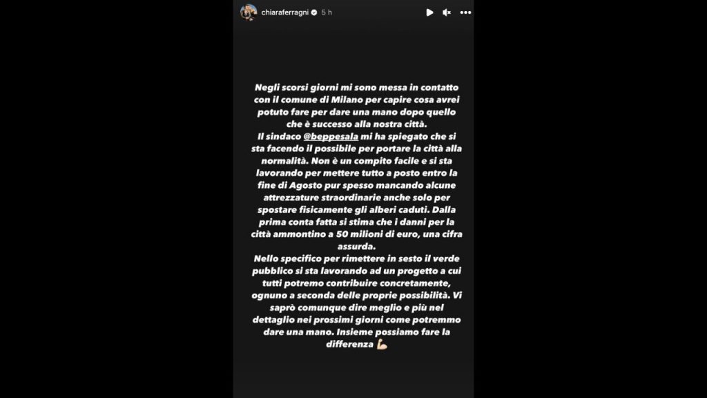 Non sappiamo quale sarà il finale ma è certo che, soprattutto quando in ballo c’è la città di Milano, Chiara Ferragni è presente in prima linea. L’imprenditrice ha una vera e propria devozione per la sua città nonché suo fortino e sede lavorativa. Eccezione a parte è il caso Como, verso la quale la Ferragni nutre una vera affinità elettiva. Proprio la città di Milano è stato teatro infernale di nubifragi che hanno seminato disagio e problemi per tutta la sua estensione, tra tetti divelti e alberi abbattuti dalle raffiche di vento.